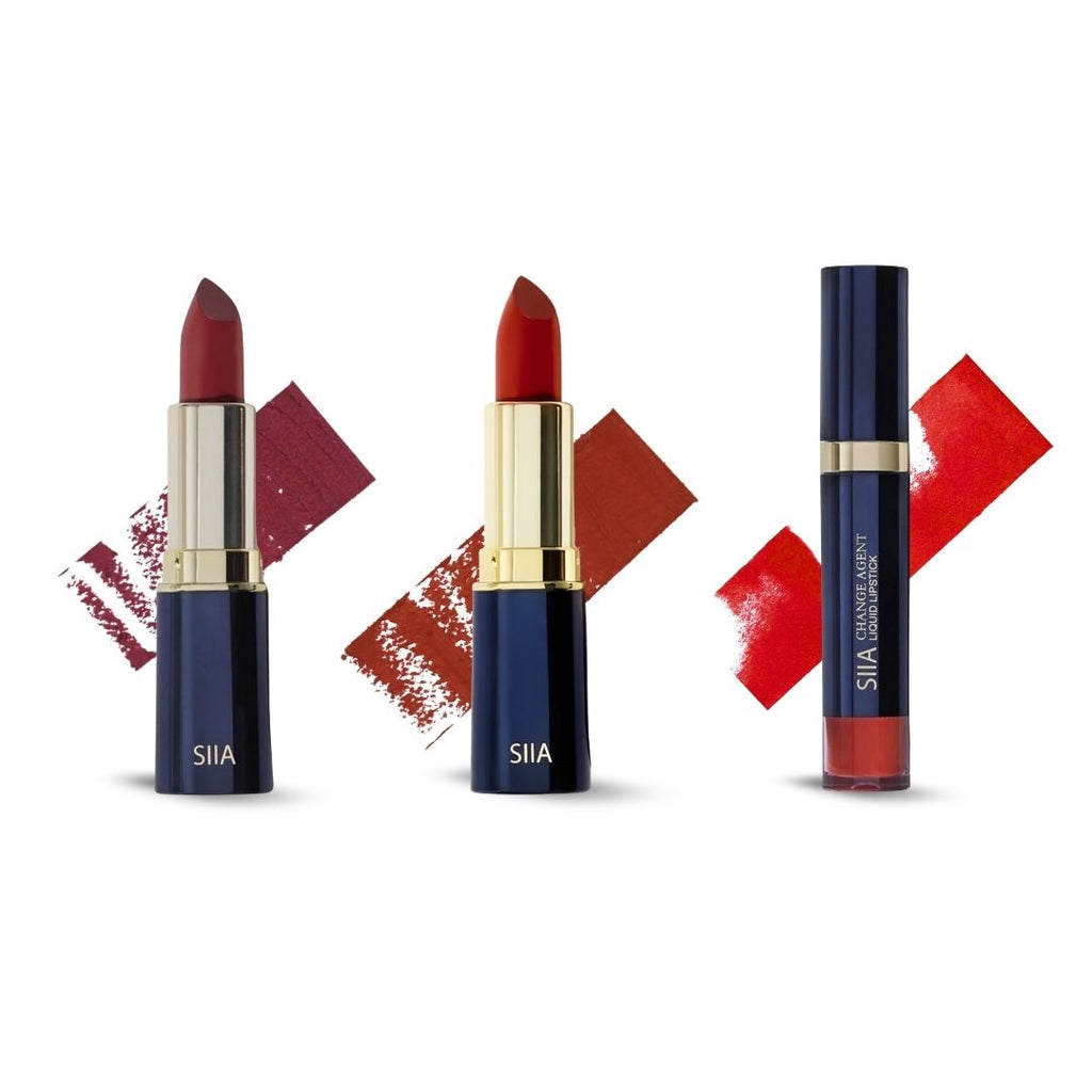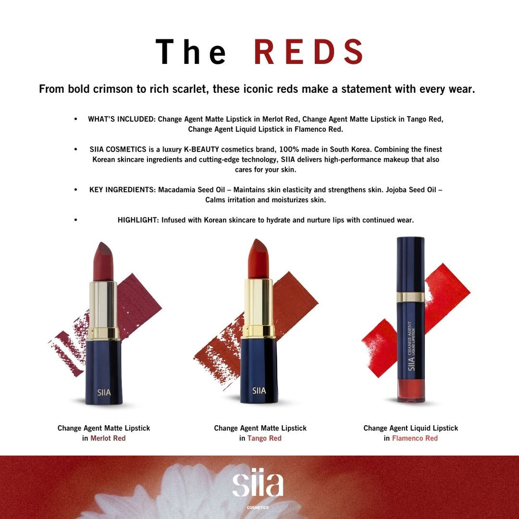 - WHAT’S INCLUDED: Change Agent Matte Lipstick in Merlot Red, Change Agent Matte Lipstick in Tango Red, Change Agent Liquid Lipstick in Flamenco Red.