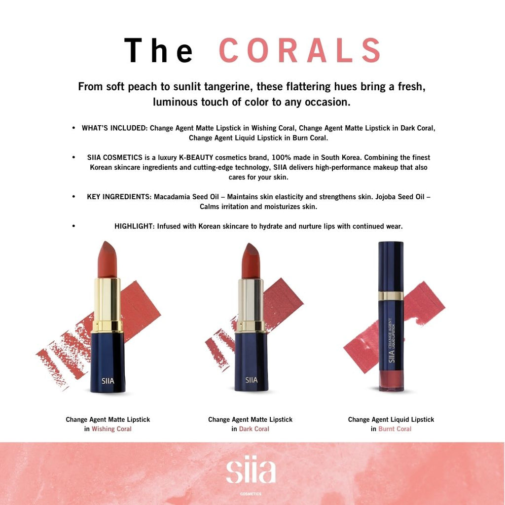 - WHAT’S INCLUDED: Change Agent Matte Lipstick in Wishing Coral, Change Agent Matte Lipstick in Dark Coral, Change Agent Liquid Lipstick in Burnt Coral.